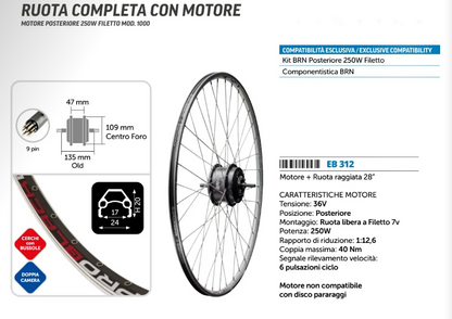 Motore Posteriore + Ruota raggiata 28" 250 W a Filetto 7 velocità. Ha una tensione di 36 V, un rapporto di riduzione 1:12,6 e una coppia massima di 40 Nm.
